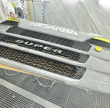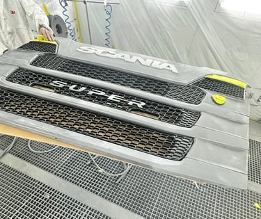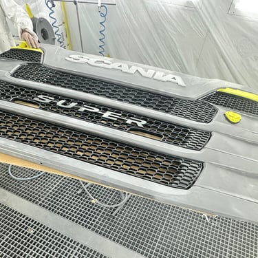 Aujourd'hui, on s'attaque à la préparation esthétique d'un Scania S560. Au programme, passage de la calandre et du bas de caisse en noir brillant.